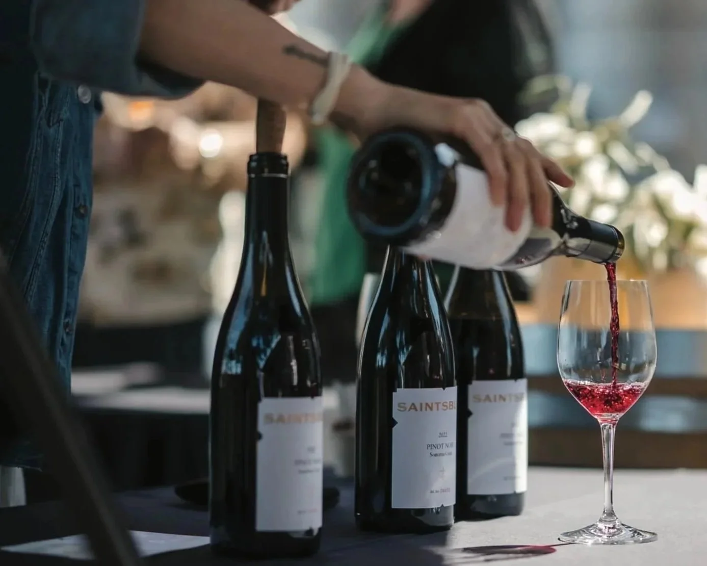 A woman at the Saintsbury Winery tasting room in Carneros pours Pinot Noir into a wine glass.