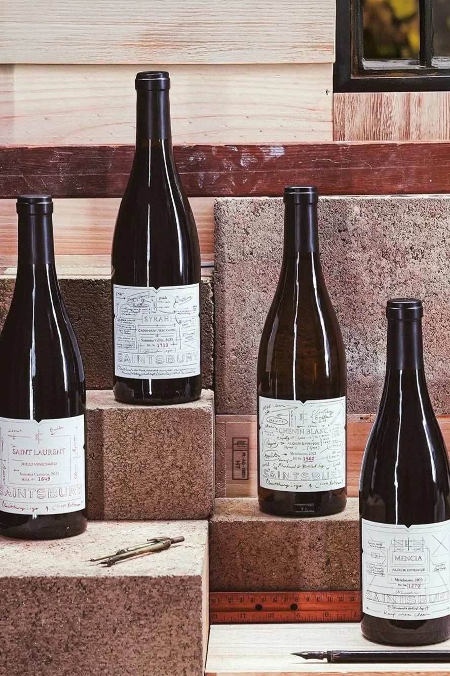 The image shows Kevin Landwehr’s custom typographic label designs for Saintsbury Wines’ Winemaker Series. The labels are drawn directly from the designer's notebook, reflecting the thought and process behind each wine. The tactile cotton paper and active-nature of the designs support Saintsbury’s philosophy, “The joy is in the work.” The bottles are placed on rustic cinderblocks against a backdrop of raw wood and measuring tools, emphasizing the artisanal, inventive theme of the series. Featured: Ricci Vineyard Saint Laurent, Alder Springs Chenin Blanc, Canihan Syrah, Alder Springs Mencia.