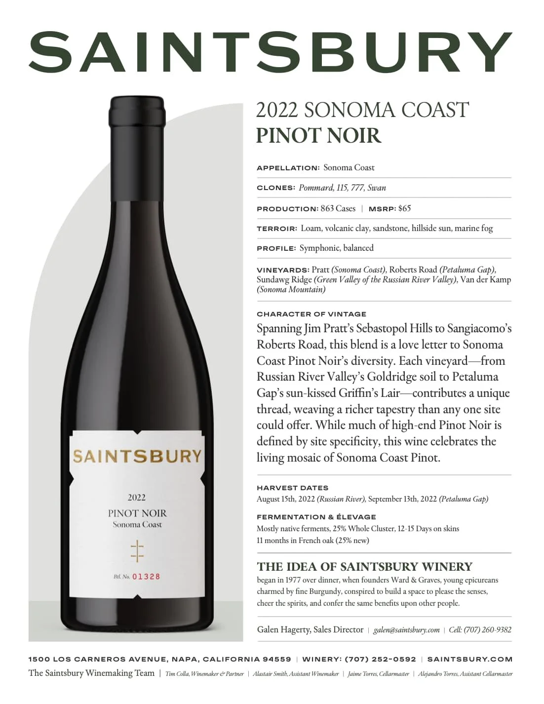 Labels for 3 tiers of Saintsbury wines: Ricci Vineyard Saint Laurent, Alder Springs Chenin Blanc, Green Acres Chardonnay, Vandal Vineyards Pinot Noir, Sonoma Coast Chardonnay and Pinot Noir.